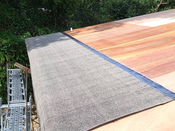 夾板用自攻螺絲鎖進C型鋼後貼上防水毯,防水毯是自黏的,類似貼紙一樣的施工方法! 撕掉背面保護紙就可以直接貼上去,待太陽曬熱後瀝青融化就會黏到不行了! 角落回折的地方可以用噴燈加熱一下再貼上會更伏順勞靠! 表面灰色是細砂,可以方便人站在上方施工,不會黏住腳! 防水毯上方深黑色的是沒噴上細砂的地方,是給上下層的黏合處,上面膠膜撕開,把上層直接蓋下層就黏上去了!交接處大概重疊10cm,由下往上貼,上層蓋下層!