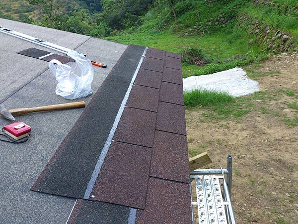 這個屋頂的工作除了夾板搬上屋頂最好兩個人外,其它都可以一個人完成,不過要將防水毯跟可樂瓦抬上去還是有些吃力,要很小心!釘瓦片的時候要長時間在屋頂,黑色防水毯跟瓦片都會吸熱,所以最好挑太陽小點再做,不然就是等冬天順便做日光浴那就最完美了!