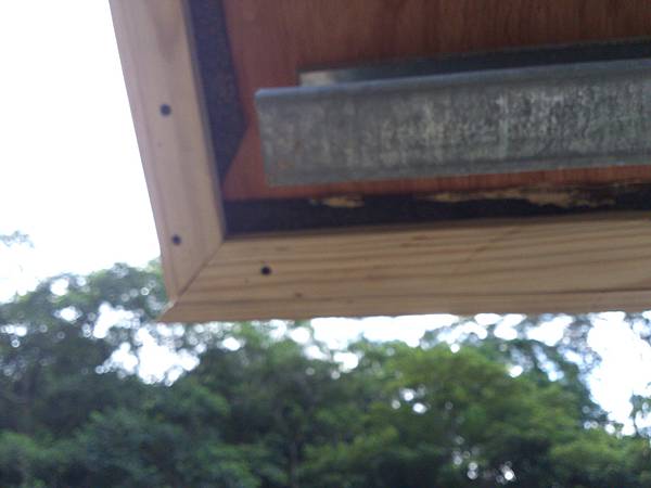 南方松內側黑色是防水毯,我將它折進來避免夾板側邊沾到水,之後用美工刀修齊!