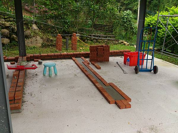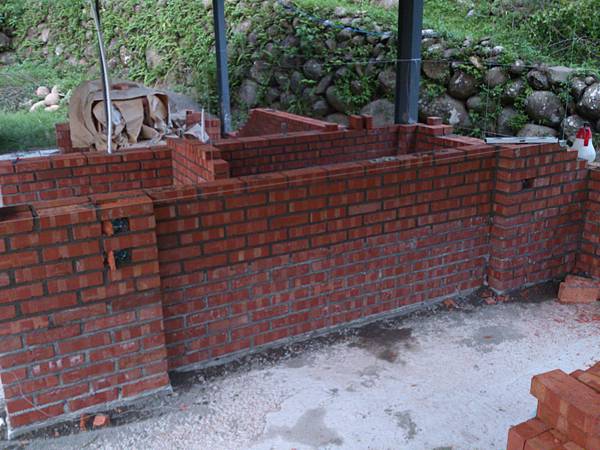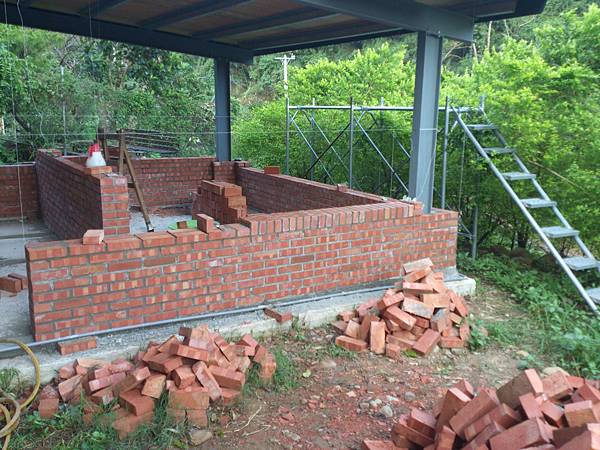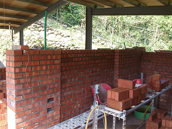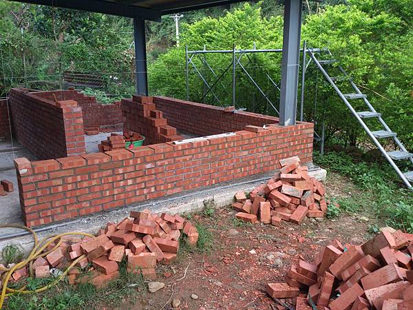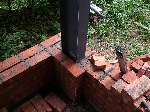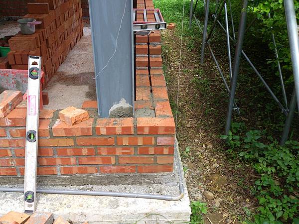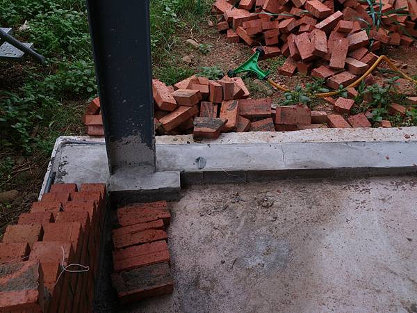右邊柱子的形狀出來了,看起來很厚實有質感! 因為牆必須連續交丁不能斷,所以牆都必續砌到門洞或窗框處才能停住! 照片前面這堆磚就是品質不良的C級磚,準備日後蓋工具間的!