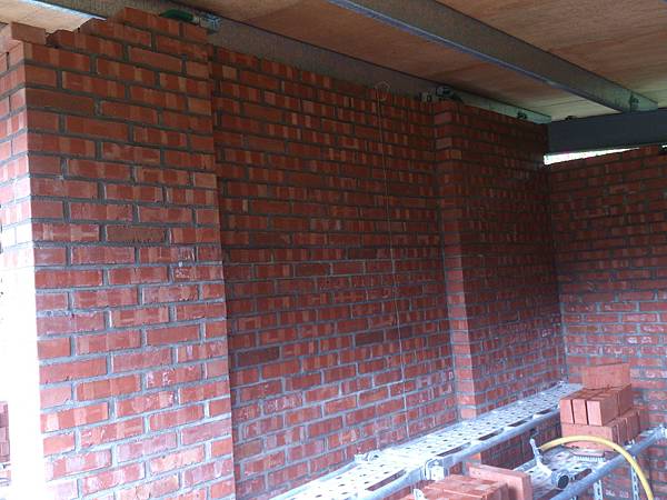 這張可以清楚看到,臥室的4面牆是要一起砌的才能達到每面牆互相交丁的要求,當然一般工法為了好做會先砌完一面牆,連接處留鉅齒狀來做連結,但是這樣在連接處無法讓磚砌的很方正,會歪歪斜斜的,並且磚縫的水泥也不容易滿漿,對品質和外觀都不好!
