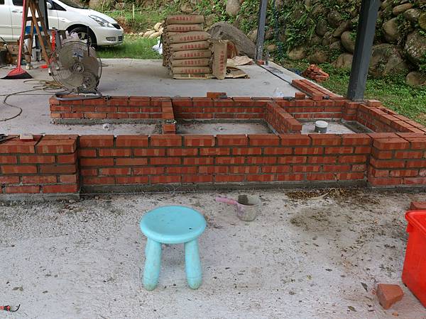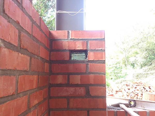 床頭兩側有預留開關和插座的BOX 在牆體內! 在砌牆時不是單砌這面牆還要砌相連結的牆互相交丁,所以一次只能砌個7,8層,相接觸留階梯狀(照片右上角)然後去砌另一面牆接過來! 一開始憲哥笑我....這個高度可以開始養豬了.....以前豬圈就差不多這樣高!