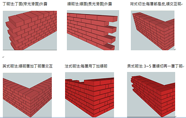 這是一般砌磚的工法,在台灣一般8吋牆的砌法應該就是英式或美式的砌法,也就是第一層用丁(縱向)第二層用順(橫)砌的! 這樣的好處是每顆磚的左右上下都交(勾)丁,也就是次一層的接縫處不會在同一重直線上,這樣可以增加強度,因為水泥和磚是不同材質,在黏著面會是最脆弱的,尤其如果施工品質又沒控制好會更容易從接縫處裂開,路邊有時會看到有些老的3合院磚房因為早期地基不良的問題,如果下方地基流失就常看到牆順著接縫處呈梯型裂開了!