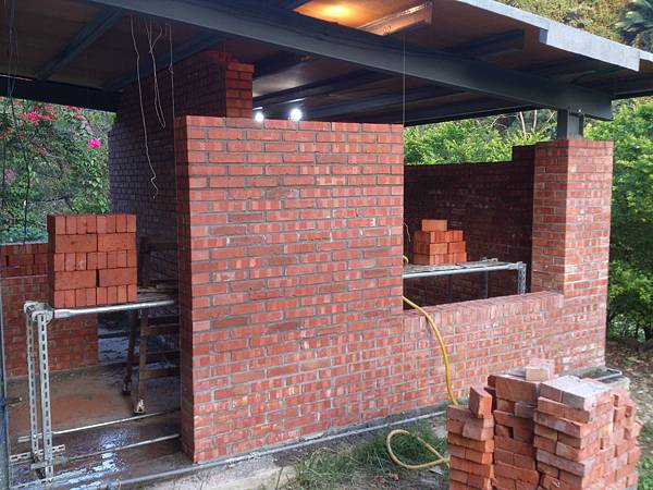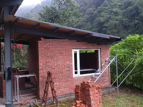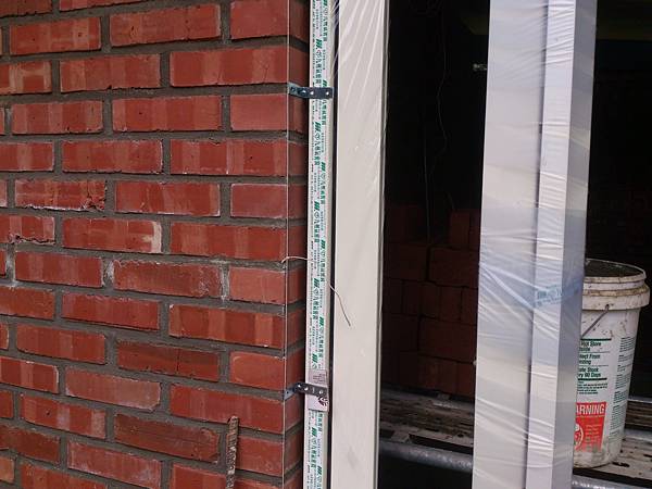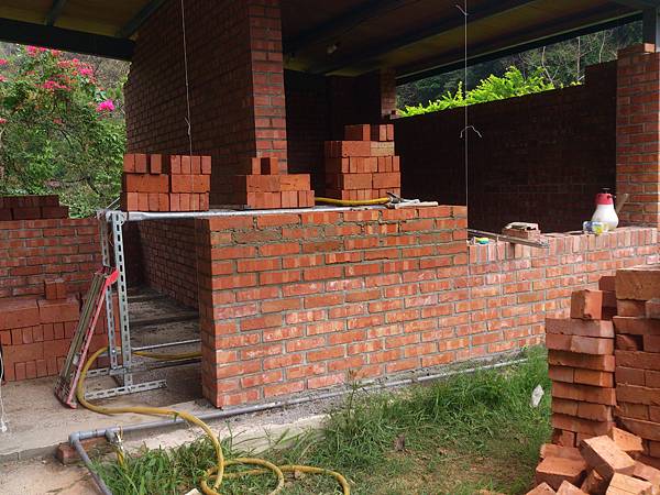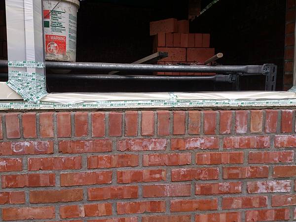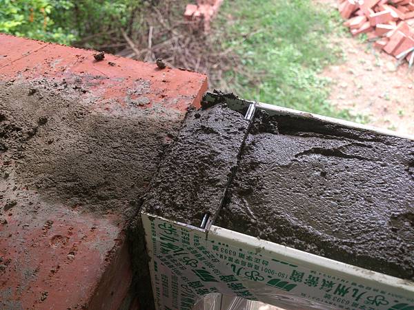 上面可以看到在牆的兩側,右邊的窗框和左邊的門洞都有交丁收邊,這也讓這道雙牆結構的獨立牆形成口字型的結構! (口字型結構上一篇有解釋過) 磚縫間的水泥在磚的重力壓擠下會些微擠出,在微乾(還QQ的)後用抹刀刮除再用專用工具勾縫後擦拭乾淨!