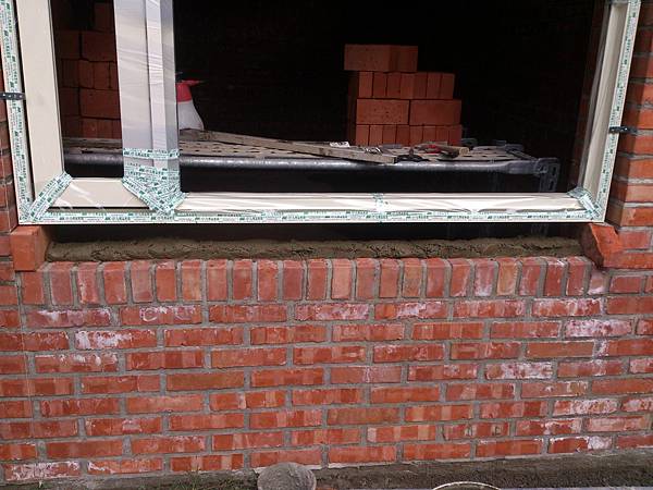 水泥量要比窗框內空間多一點點,讓下壓後水泥擠出,確保水泥可以填滿窗框內! 這裡我疏忽了一件事,磚牆沒淋濕,好在日後沒漏水! 我窗台上的磚都故意斜放,室內高室外低,讓窗戶流下來的水到磚牆的窗台上有洩水坡度流到外面,不至於積水!