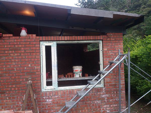 一開始計劃的時候想說磚屋應該配木框窗比較有味道, 買了一堆南方松! 後來蓋屋頂收邊的時候用掉一些,裁切的時候就發現了,南方松沒有想像中的軟,它的木紋纖維真的蠻硬的很難處理,這當然跟我的鉅台有關係,不夠力! 其實最重要的是我發現南方松非常容易變形彎翹,拿來做窗戶,門框應該會死的很慘! 於是立馬修正計劃,還是用鋁窗好了! 找了一個認識的鋁窗廠商跟他訂了2扇推窗不含玻璃,一大一小分別給臥室和廁所,我自己去載回來安裝,沒想到後來竟然發現給我的價格跟別人到府安裝而且是含玻璃差不多! 真的是.....XXX