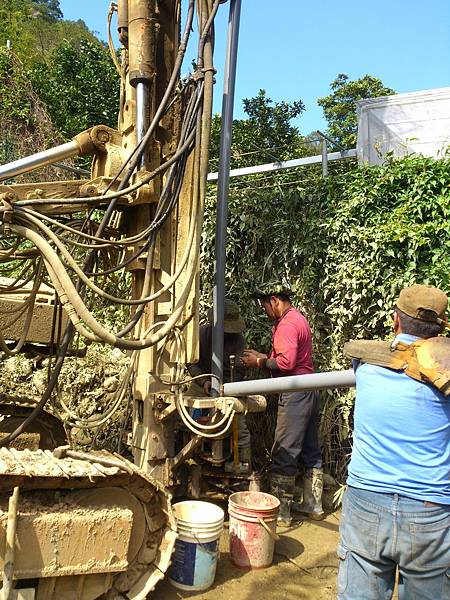 鑽下去第一支管子後,地上就有看到土石碎屑了! 師傅正抬著第二支鋼管要接進去! 每支鋼管約2米長! 地下果然充滿大石頭,當鑽到大石頭時可以聽到聲音變尖銳! 甚至還有鑽了一隻鋼管才通過的大石頭呢!