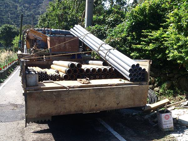 車上左邊的小鋼管是套在中間大鋼管內! 小鋼管第一支頭部有鑽頭負責鑽碎土石,另外還有一台大型空壓機會將空氣打入這兩支管的中間,利用氣壓將土石碎屑吹到地面! 最右邊是PVC 水管,準備鑽完套在井壁上!