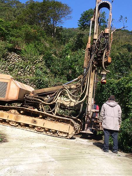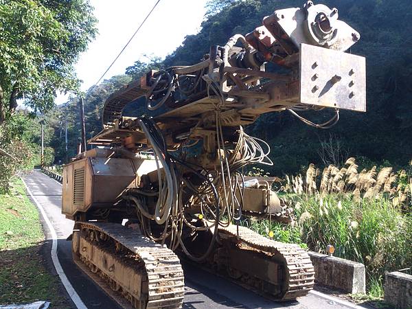 鑽井的履帶車用拖板車送到外面路口再自己爬上來, 看到的時候嚇一跳! 真是有夠大台! (照片顯現不出它的具大感)