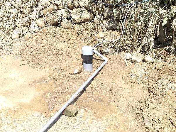 鑽到30幾尺(約10公尺)深,遇到了表層水,但是這一層水比較容易受地表果園和其它廢水汙染,所以不用! 一直鑽到130~160尺遇到第二層地下水,老闆覺得水量夠就停了! 照片上是鑽完後在套PVC 管保護管壁!