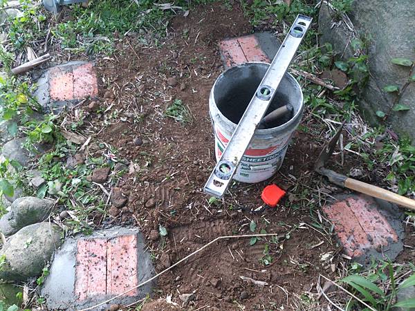 安裝水塔前先用C 級的磚塊砌4個小柱頭,磚砌兩層,大部分埋在土裡!四點也要用水平尺抓一下水平!(C級是我蓋房子淘汰的磚)