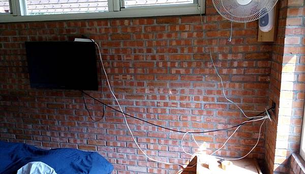 一開始沒打算在臥室放電視,但是因為客廳還沒好就暫時將電視掛在床前的牆上!看著看著也習慣了!因為一開始沒有計劃所以也沒預留電視的天線和電源出口....臨時用的就從旁邊柱子插座拉延長線過來,訊號線也是從外面經過這個box 拉明線到電視!再加上風扇的電線就像盤絲洞一般的亂了!也是今年初(2016) 終於看不下去了,提起勁來處理它,當然也是想很久要怎麼跑線又不傷磚牆外觀!