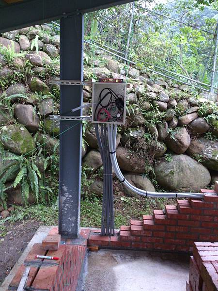 這是我的電源開關箱,之前憲哥將纜線拉上來,暫時幫我接上電給我用! 到了我要砌牆時必須先斷電,把管配好再將電線穿入PVC管中,並接入開關箱! 另外其他預留的電管有些從地面上來,有些從牆走過來也必須接入箱內,箱子還要固定起來才能開始砌這面牆! 光整理這些管線和電箱就搞了快一天了! 還好都沒接錯,晚上還是有電!
