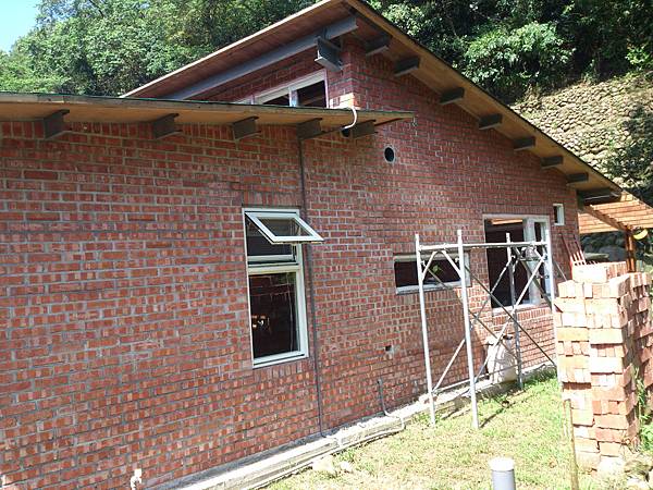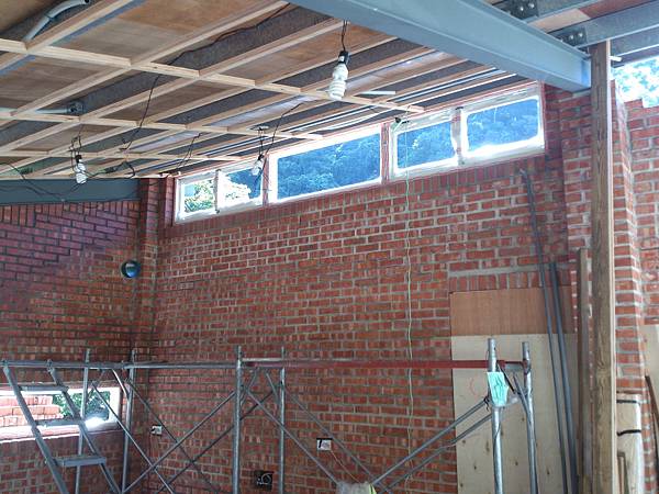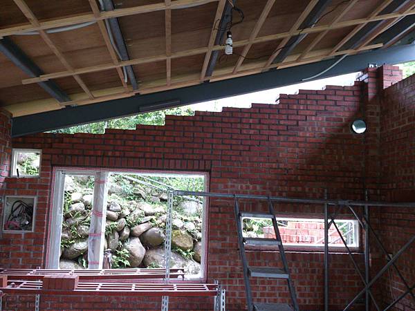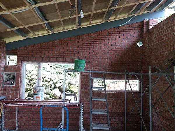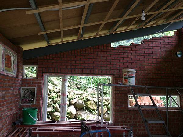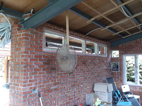 窗戶安裝上去再往上砌!之前在等窗戶來的時間就先把天花板角材釘上去了! 牆上我放一支PVC管要穿牆預留給冷氣管線用,老是做到忘記....以後再鑽吧!