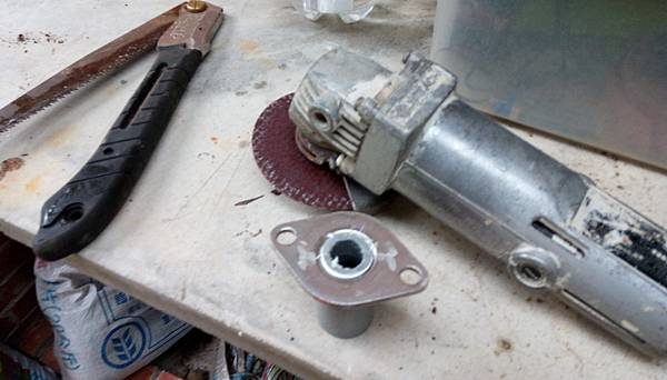 PVC的水管頭要鎖上不鏽鋼片,但是螺紋太長會頂到馬達,所以就拿砂輪機切平!