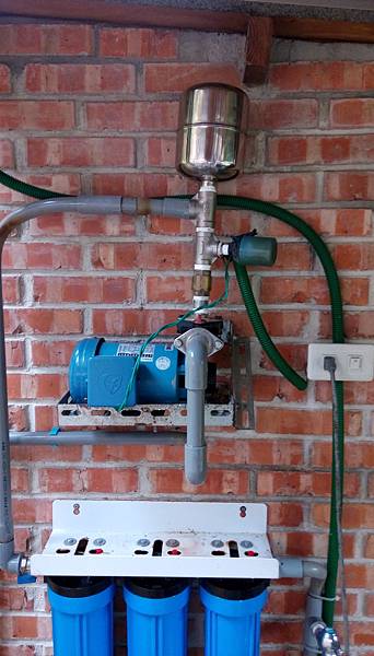 最後乾脆將出水進濾水器的部分改成高壓管,用快速接頭! 這樣拆裝就沒問題了! 不用再鉅PVC管了! 下方PVC管是進水,經過馬達往上透過逆止閥(銅色的) 再透過3通轉PVC管再轉高壓軟管出水到下方濾水器! 當然3通也可以接6分轉公4分的直接接高壓軟管,但是我手上沒轉接頭所以用PVC管來轉4分! 背面磚牆是工具間的牆面,是用淘汰下來的磚砌的,當然也隨便砌的,所以比較粗一點...