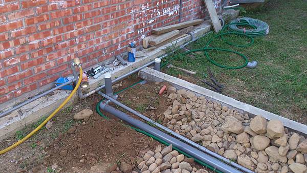 地基的部分我是先用南方松當模板,灌兩條12x12cm 的水泥邊框將預定的區域和工具間及臥室的地基圍成一個四邊形! 並將洗衣機的排水和給水也配好,除了洗衣機外還有洗手檯和加壓馬達的水和電管也一並先在地面下配好! 下圖左邊是洗手檯,右邊是洗衣機的預定位置! 可以看到加壓馬達還在靠近地面處,之後就被我移到高處了! 我的小菜園有無限多的石頭.....挑起來後比較中形的就拿來墊在地基下,一方面消化石頭順便減少水泥用量! 石頭並不是亂放上去的,也要一顆顆立起來排好,但是不能超過預定的地平線,還要有空間讓水泥流進石頭間的縫隙!
