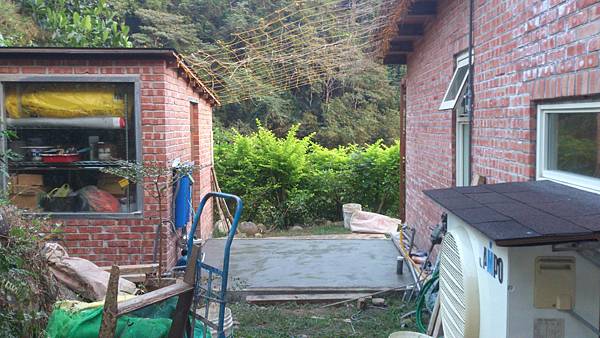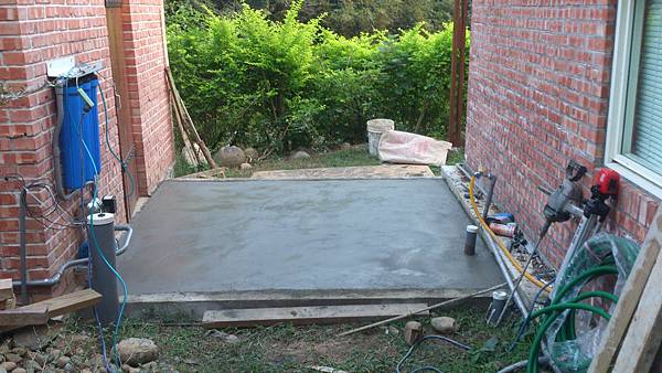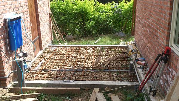 水泥灌漿並且抹平粉光後地板高度和工具間約略相同,但是低於房子主建物! 不過忘了做洩水坡度.....左前方角落日後有一點積水!