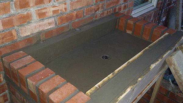 洗手水槽! 排水和進水也有預留了! 水槽兩側是磚砌的,前後是水泥灌起來的! 外側這邊也做一點斜度,看起來不會呆呆的!