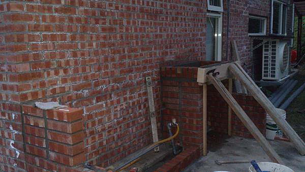 洗手台味道也要對,所以也用磚砌起來! 另外一邊要做一個檯面,下方可以放肥料雜物之類的! 洗手台側牆剛灌水泥,用角材撐住!