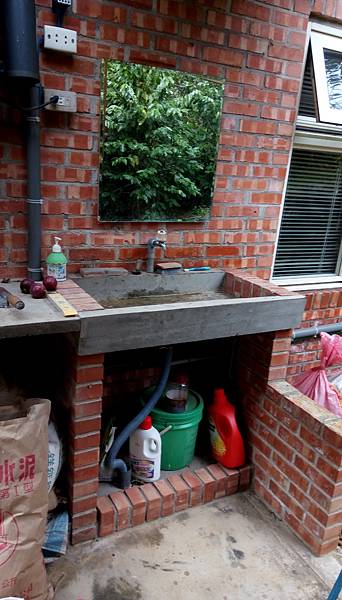 這是一年後照的照片,長青苔,雜物也多了! 剛好友一片鏡子有缺角,一直沒丟,就裝上去了! 這個洗手台主要是較髒的衣物手工刷洗和室外工作完洗手用的! 一定有人會問...會漏水嗎? 答案是不會! 只要砌磚前磚有浸濕,水泥比例對就不會漏水了!