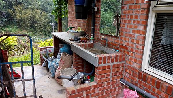 洗手台再過去是水泥檯面,也是雜物一堆了! 剛完工很整齊漂亮時都忘了照像了!