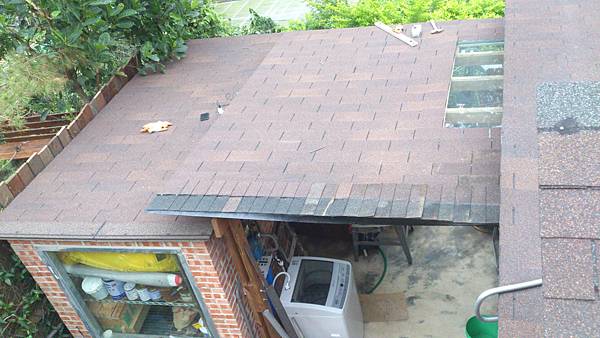 從上俯瞰屋頂,從左看來是工具間,洗衣房和右邊的臥室屋頂! 其實一開始沒有計劃這個洗衣房,所以再蓋工具間時也沒考慮屋頂高度銜接的問題,所以洗衣房的高度就抓中間,看起來有層次,也是不錯看了! 屋頂高度依次上升也算是步步高升了!