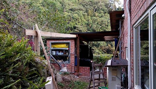 照片中間黑色的是洗衣機,我媽媽幫我用不織布車了一個套子防日曬! 這個洗衣房兩面沒有隔牆,只有矮牆來區隔內外,這樣比較明亮乾燥,空間感也比較大! 矮牆上方也可以再用不同材質隔間,像是木格柵,玻璃或鐵網等,再裝上前後門! 但是還沒有計劃去做! 目前這樣進出及工作也方便! 整個結構是立了兩隻南方松柱子在工具間這邊,柱子間用一隻14x3.8cm 3米的南方松當大樑,小的橫樑搭在上面,右側用角鐵固定在臥室面的磚牆上! 上面一樣鋪18mm夾板,再釘南方松! 要立兩隻柱子而沒有直接搭在工具間的原因是屋頂要拉的比工具間高所以就要另外立柱子了!