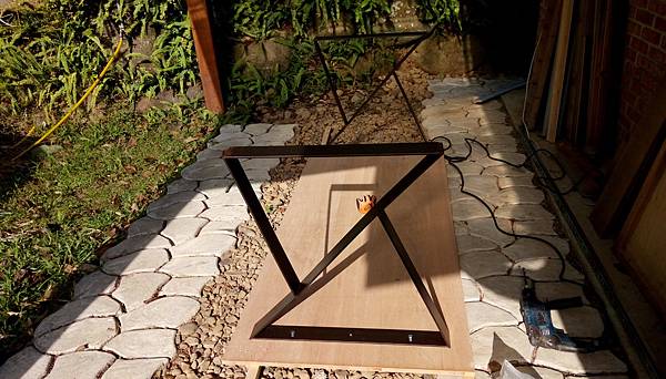 橫桿就順著桌腳的斜度鎖起來! 兩隻橫桿中間再鎖隻扁鐵互相拉住增加強度!