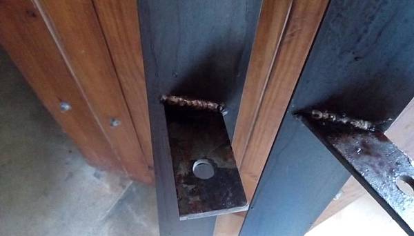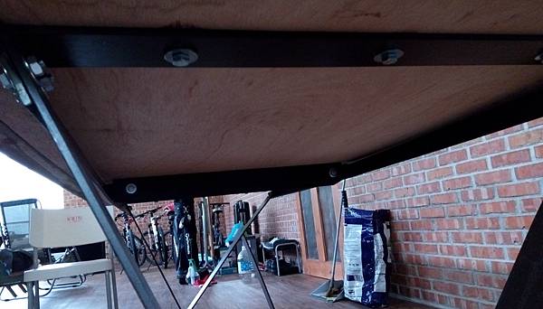 桌下角度看兩支橫桿中間垂直鎖住的扁鐵!