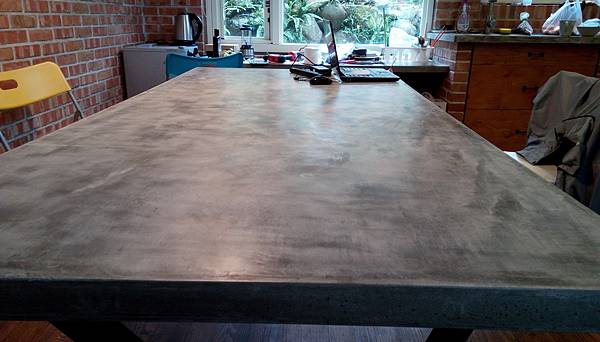 水泥透過粉光時灑上水泥粉也能有顏色深淺變化,再透過抹刀可以抹出不規則的深淺變化,有一點像石材的感覺! 我是技術還不夠好,花紋還做的不漂亮,相機不好,照片也照不太出來實際的樣子! 水泥是樸素的材質,在燈光下,坐在餐桌前近距離才能滿滿欣賞它的花紋之美ㄡ! 下面是我上了一點臘,有一點點光澤,顏色深淺也出來了,比較有變化!