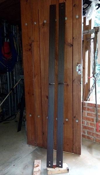 兩隻橫桿,兩頭各鑽兩個12mm洞來鎖螺絲! 中間焊一片鐵片可以鎖另一扁鐵加強!